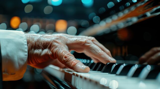 This image captures the wrinkled hands of an elderly person skillfully playing the piano, emphasizing the fingers and the musical keys, showcasing the talent and passion for music.
