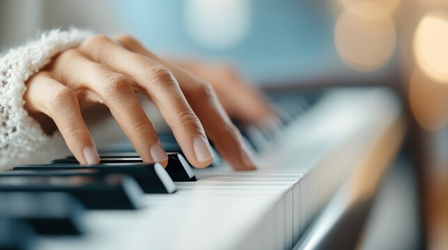 A gentle focus on a person's hands skillfully playing a piano, highlighted in soft, warm lighting, capturing the essence of musical expression and creativity.