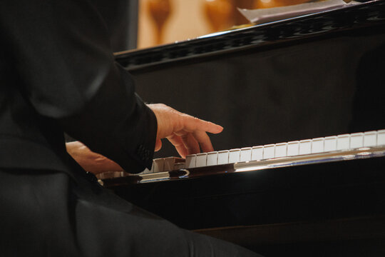 A person is skillfully playing a beautiful piano, their hands gracefully positioned over the gleaming keys, creating enchanting music that fills the air with joy and emotion