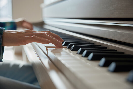 A close up view of a person skillfully playing a piano, their hands gracefully moving across the keys with precision and focus