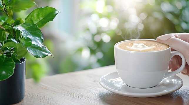 A person enjoying a warm drink while using a smartphone in a cozy setting during the morning