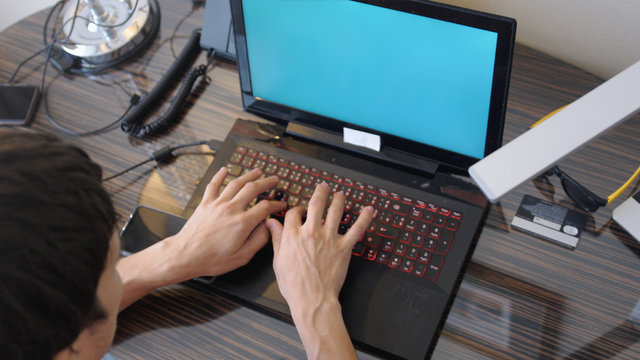 Creative Black Person Holding a Tablet, Viewing Content on a Computer with Green Screen Mock-Up Display. Photo Template with Placeholder for Small Business Advertising and Corporate Content