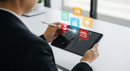 Person using tablet with holographic interfaces for digital property management, online mortgage applications, home appraisal and e-sign contracts, highlighting real estate tech efficiency