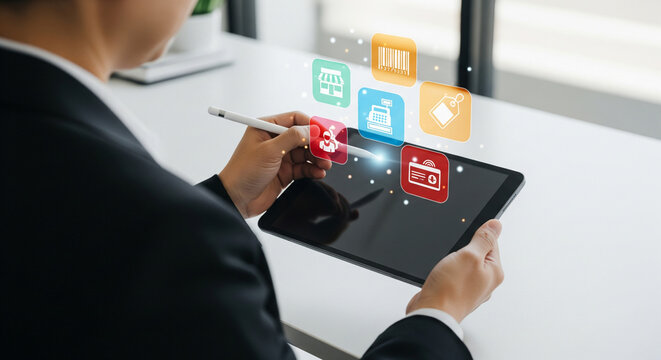 Man uses tablet computer, touching screen with glowing digital data. Futuristic interface with binary code and bokeh lights background. AI and business concept.