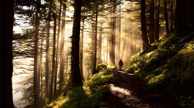 Silhouette of a person walking down a misty forest path illuminated by a radiant golden sun shining through dense autumn trees