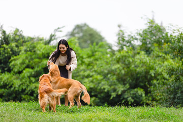 Frame with a beautiful girl with a beautiful dog in a park on green grass.