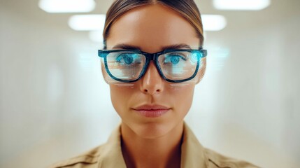 A woman wearing smart glasses, showcasing augmented reality technology. The close-up shot highlights the tech interface overlaid on her vision.