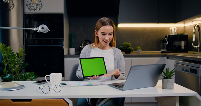 Caucasian woman working remotely with green screen laptop for mockups