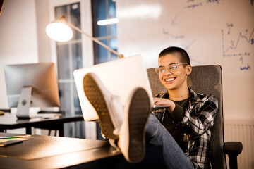 A man at a laptop presents a holographic interface with a glowing row of icons for education and knowledge (graduation cap, lightbulb, book, etc.), symbolizing e-learning and personal development. Pho