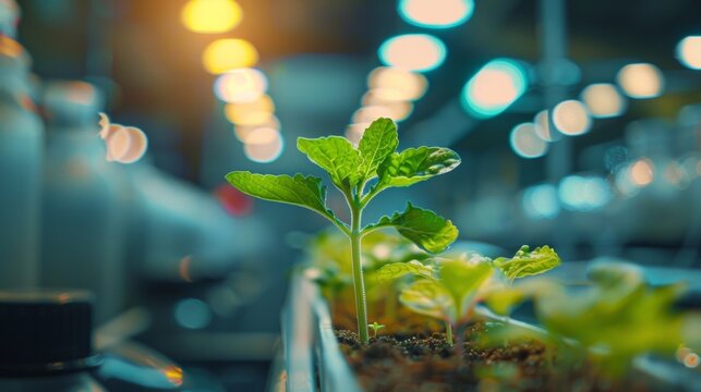 A homemade genetically modified plant growing in a hydroponic setup showcasing the potential of urban biohacking and sustainable farming. .