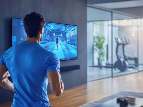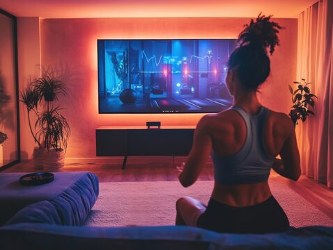 Virtual training session on large screen with person doing workout in cozy living room setting