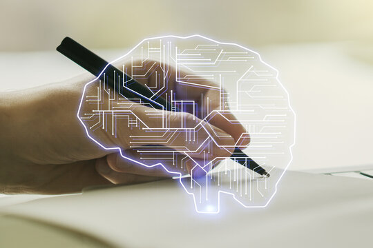 Creative artificial Intelligence concept with human brain sketch and man hand writing in diary on background. Double exposure