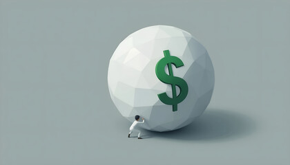 Pushing heavy financial debt uphill concept with 3D low poly character for personal finance management website header