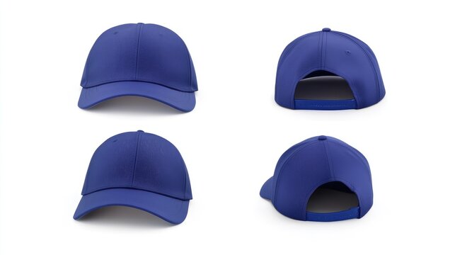 Four views of a solid royal blue baseball cap, showcasing front, back, and side profiles against a white background