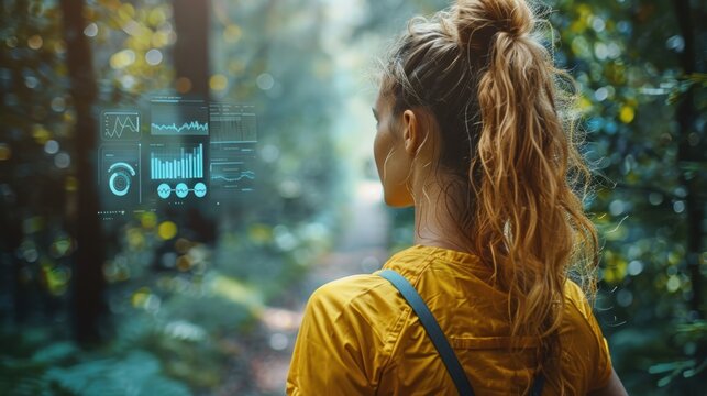 Personal trainer guiding client lifting dumbbell with fitness analytics overlay