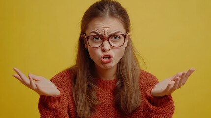 How could you. Annoyed indignant young woman spreads palms smirks face looks angrily at camera quarrels with someone feels puzzled wears spectacles and sweater isolated over yellow background