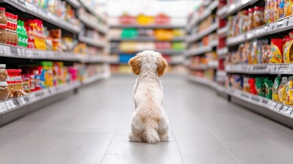 Small dog eagerly choosing food from a colorful pet store aisle, tail wagging.