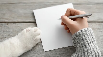 Pets insurance claim concept. A hand holding a pen above a blank sheet with a cat's paw nearby.
