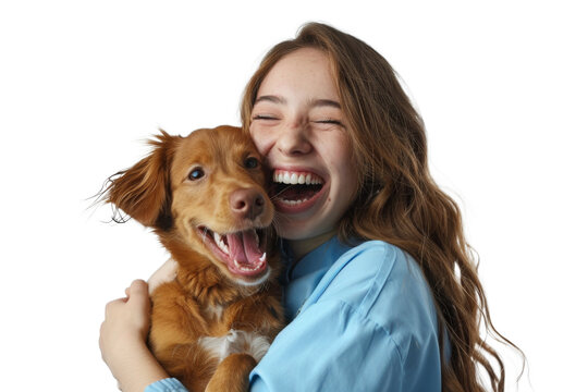 Portrait of beautiful women hugging cute dog with smile and hppiness isolated on background, lovely moment of pet and owner.