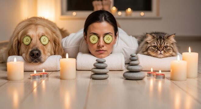 Funny home spa day with a woman, a dog, and a cat relaxing together. Owner and pets with cucumber eye masks in a candlelit room. Humorous animal pampering and self-care concept
