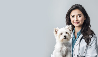 Veterinarian woman doctor and dog in a veterinary clinic. Banner. Medicine, pet care, health care. Veterinary care. Veterinary medicine concept. Pedigree dogs.