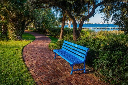 Cobalt seat set on a cobblestone walkway in a coastal area