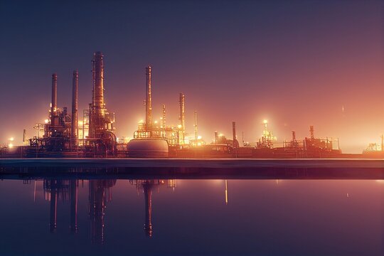 Oil refinery glows in the evening