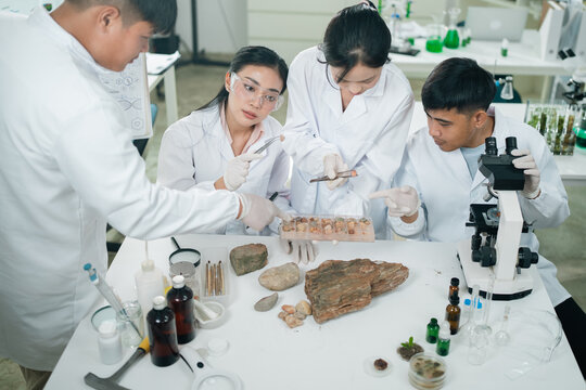 Geology researchers analyze various types of rocks and minerals in a laboratory setting, focusing on the classification of geological samples for energy resources and academic scientific purposes