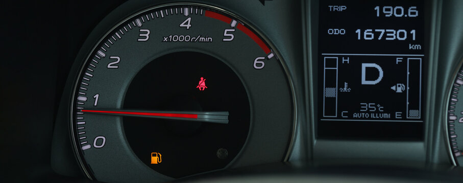 Empty fuel warning light in car dashboard. Fuel pump icon. gasoline gauge dash board in car with digital warning sign of run out of fuel turn on. Low level of fuel show on speedometer dashboard.