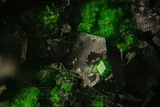Mineral Uvarovite and Clinochlore- Saranovskoe deposit. High magnification microphotography- scale of photography 10X