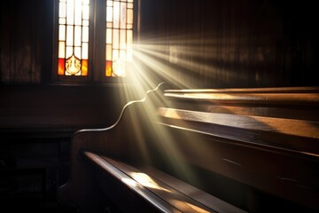 Sunbeams streaming through stained glass window lighting church aisle and dust particles