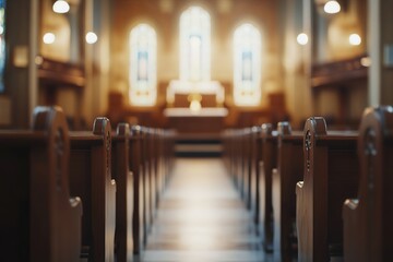beautiful sun light coming through the church window, catholic church with wooden church pews