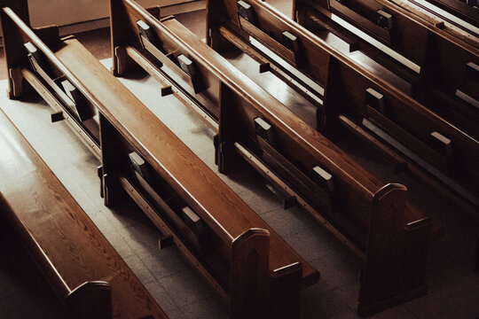 Interior of a vintage church with wooden pews or benches of red wood. The sun is shining in the building through tall clear glass windows.