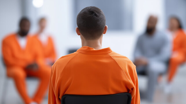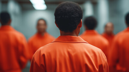 Inmates in orange uniforms gathered in a prison facility during a group session or meeting.