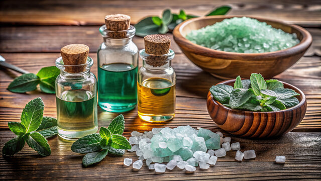 Macro shot of various organic compounds, including menthol crystals, camphor, and eucalyptus oil, arranged artfully on a rustic wooden laboratory countertop.