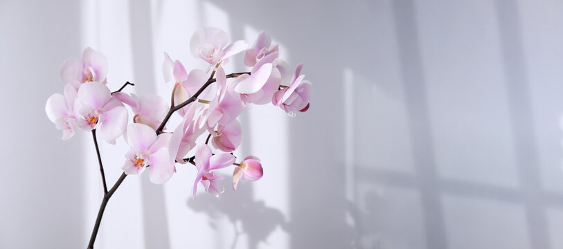 Beautiful floral background. Pink phalaenopsis orchids on a light background. Shadows on the wall. Copy space.