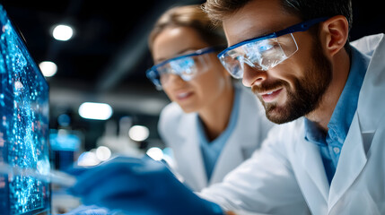 Two scientists analyzing data on a computer screen in a laboratory setting with safety glasses on