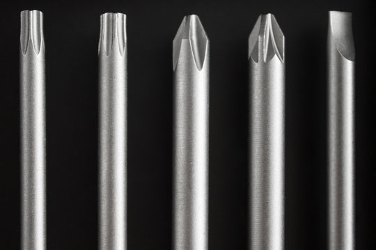 A set of long bits for a screwdriver. Different form, five kinds. Dark background.