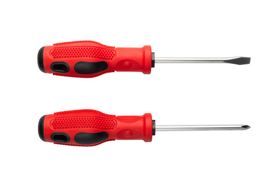 Stubby or small flat head screwdriver and cross head screwdriver, standard screwdriver and philips screwdriver with black handle  on white background.