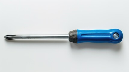 Screwdriver with Blue Handle on White Background Overhead View of Tool with Authentic Shadow Room for Text or Image