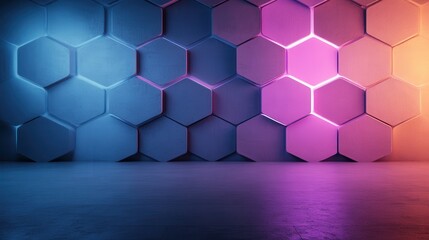 A striking wall of hexagonal 3D shapes is elegantly lit with soft neon lighting in vibrant hues, creating a mesmerizing and futuristic ambiance.