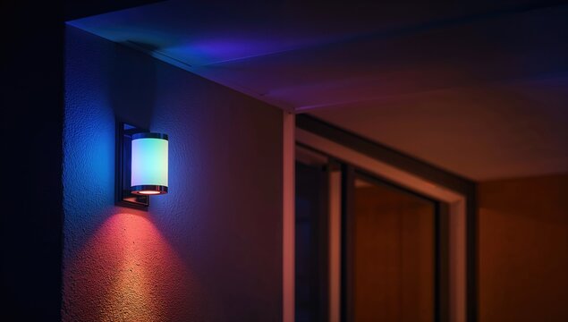 Freshly set up colorful intelligent lighting fixture positioned near a back kitchen entrance.