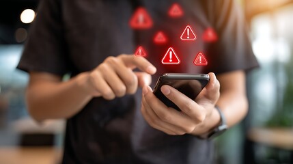 Unknown caller identification on smartphone screen with red warning alert icons showing scam or fraud telephone call attempt during work time in home office environment