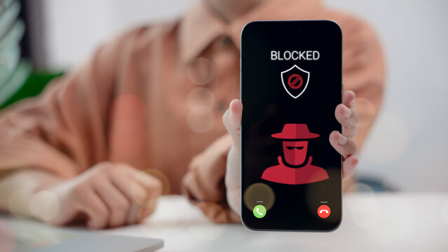 Phone screen showing scam call blocked with hacker icon and security shield. Concept of mobile protection, cybercrime prevention, caller ID alert system, and digital safety awareness.