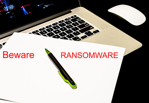 Close-up handwriting word beware ransomware on white paper over laptop with map of global ransomware cyber attack background. Cyber security concept.