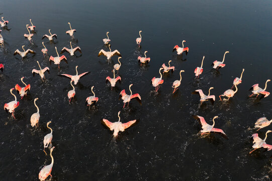 Aerial view of a colony of flamingos in Torreira, Murtosa, Ria de Aveiro, Aveiro, Portugal.