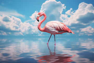 The colony of flamboyance pink flamingo stands in the clear blue water surface under the daytime sky, Generative AI.