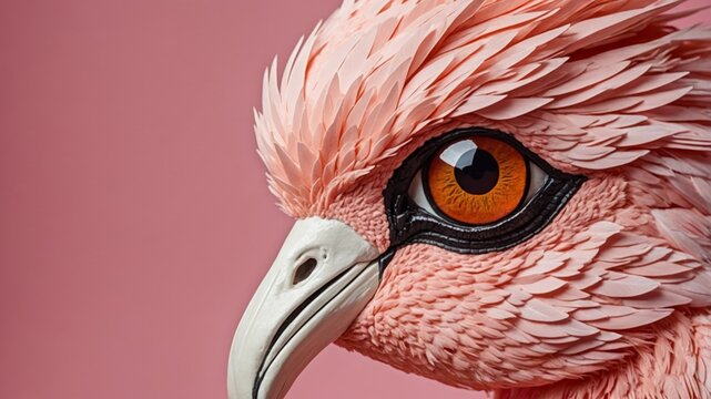 Closeup of a flamingos eye, beak, and feather on pink background.