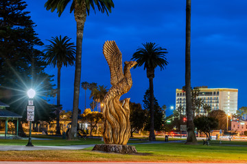 Rising Phoenix wooden sculpture appears to be taking off for flight in public city park at dawn with hotel lights in background.