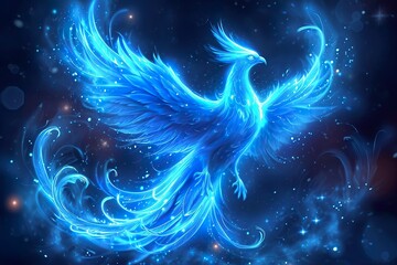 The outline of a blue phoenix, showcase interface cosmic background
